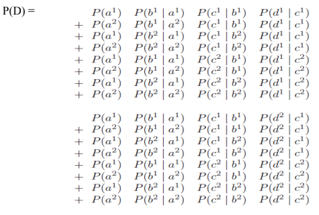 requires that we generate k^n probabilities for the different events x1,..., xn.By the chain rule for Bayesian networks, the joint P(A,B,C,D) decomposes as -