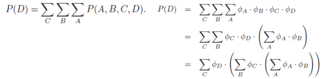 To compute P(D), we need to sum together all of the entries where D = d^1 and to (separately) sum together all of the entries where D = d^2. The exact computation that needs to be performed, for binary-valued variables A,B,C,D is